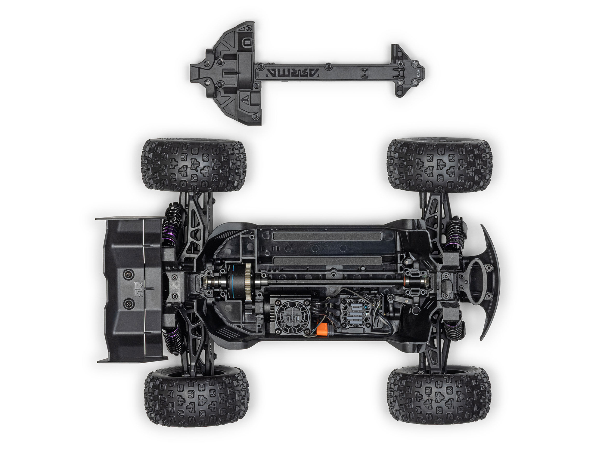 The MINI KRATON 3S BLX 4X4 monster truck body snaps onto the chassis easily, quickly, and securely, and comes off with a simple press-and-release. With no tiny clips to force into place, it's a body attachment system that's perfect even for young bashers.