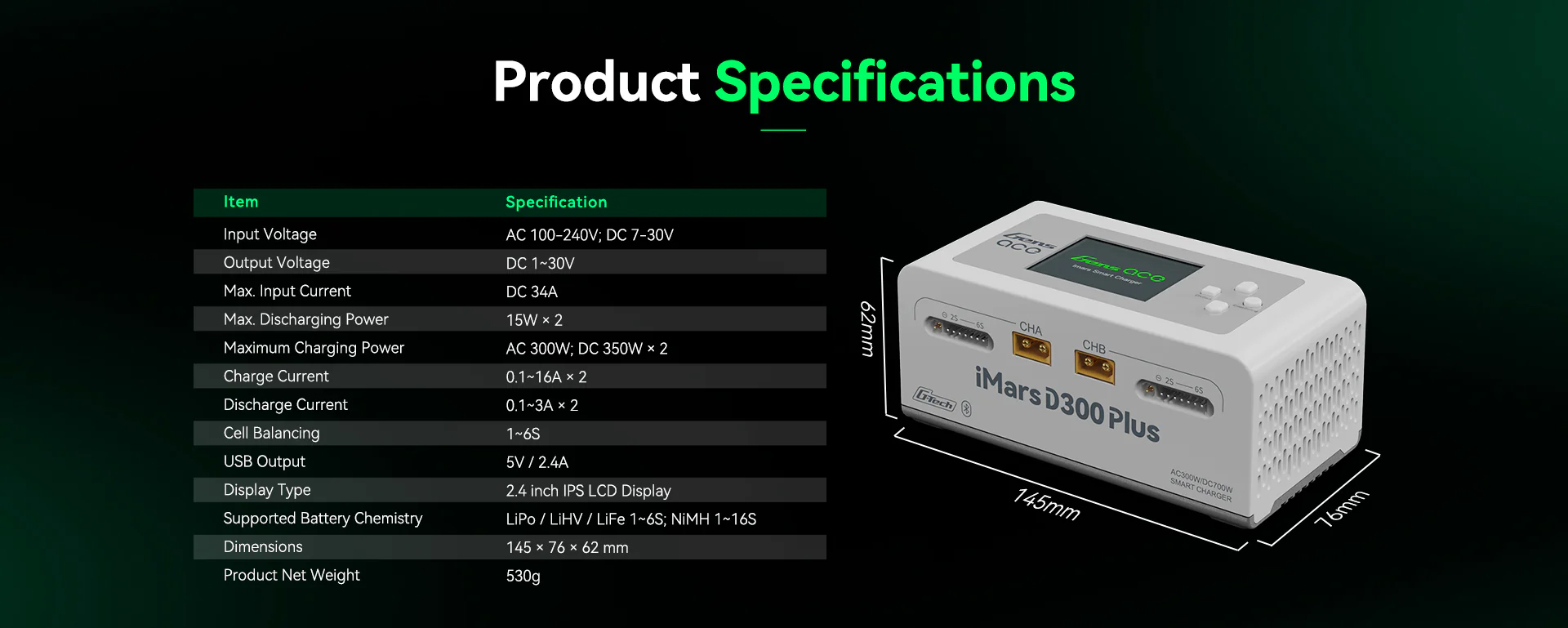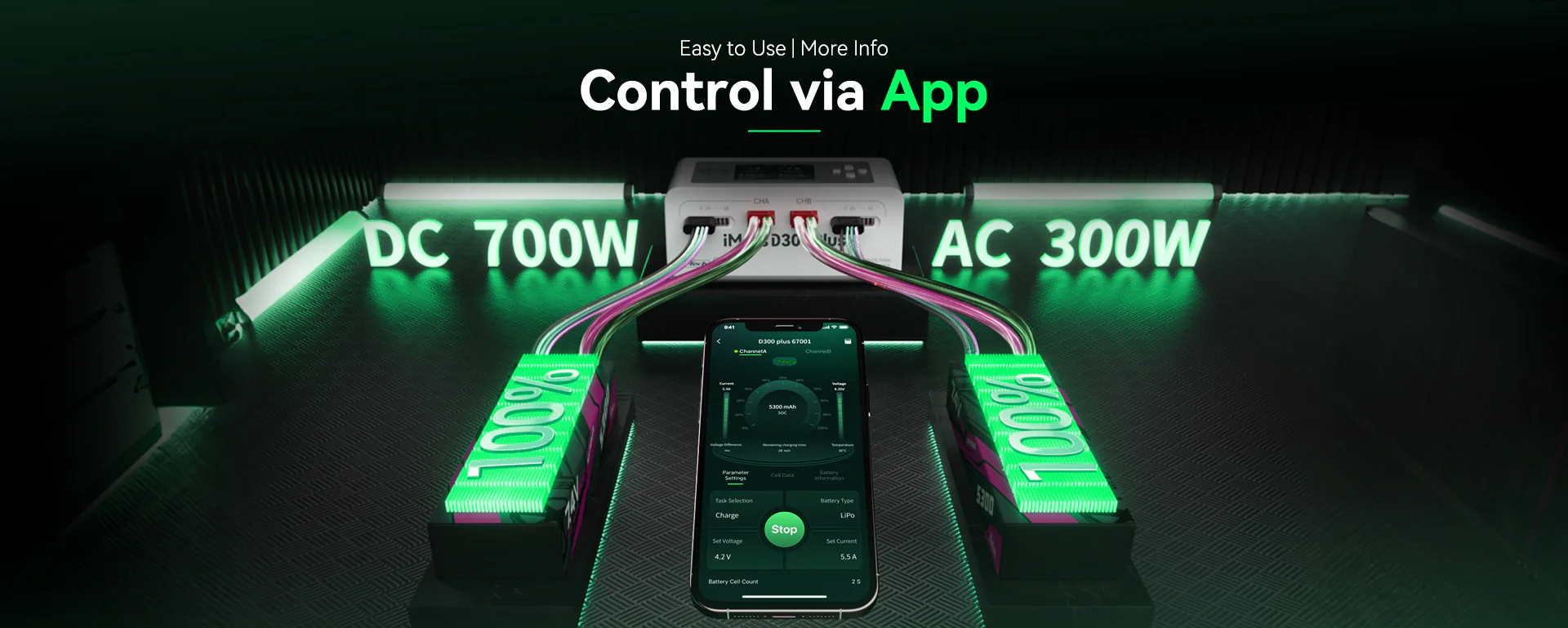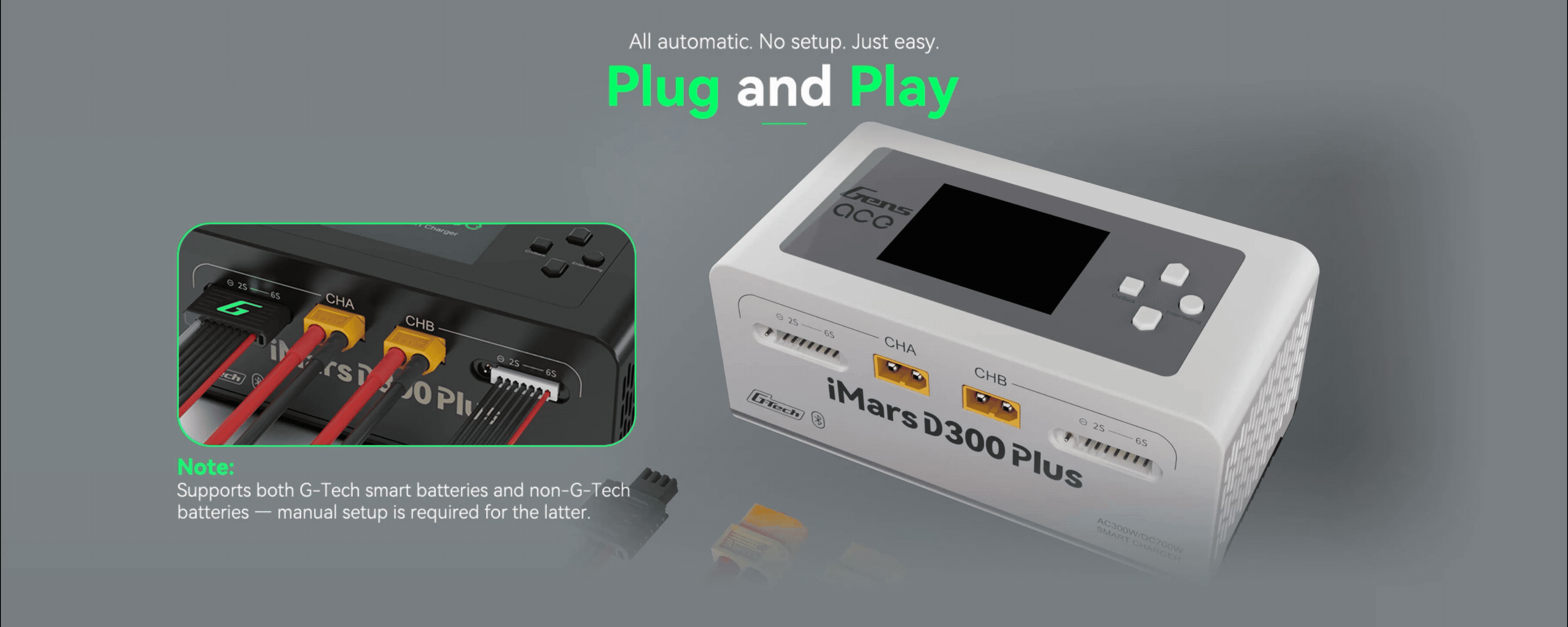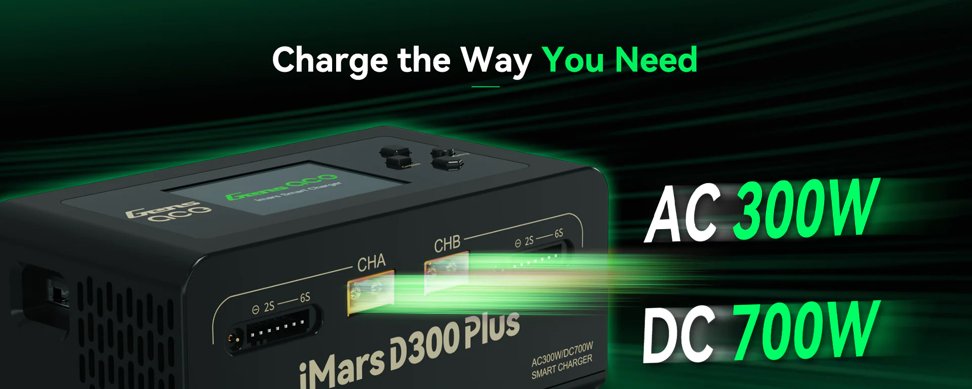The Gens Ace iMars D300 Plus is a new dual-channel smart charger based on the D300. It keeps the core features of the G-Tech system and adds Bluetooth remote control. RC enthusiasts can now use the Gens Ace app to manage and view more real-time data and historical records, making the experience simpler, more efficient, and safer.