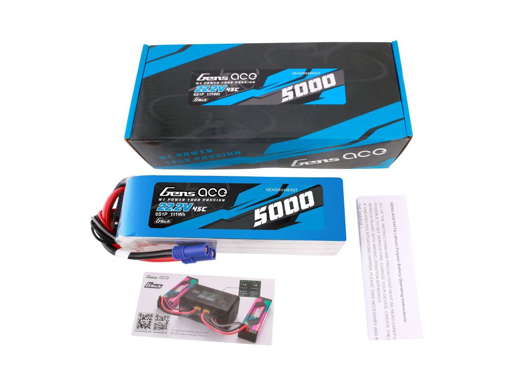 Gens ace G-Tech 5000mAh 22.2V 45C 6S1P Lipo Battery Pack with EC5 Plug is designed for best heli pilots, well used in all the big heli event,the true 45c rate, can provide the power all the helis needed, support all the difficult 3D movings and fastest speed, it can also be used in big scale RC aircraft and RC boat, smooth power and stable, make your flight exciting and power, long cycle life ensured quality.This battery is implanted with G-Tech chip and can be automatically identified, communicated and charged with the G-Tech Eco Smart Charger, and can also be regularly charged with a normal charger
