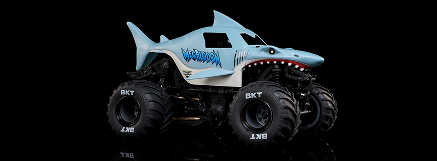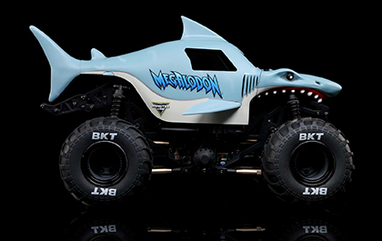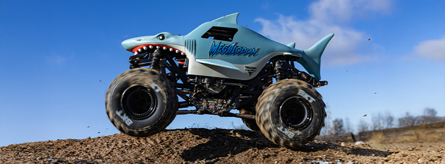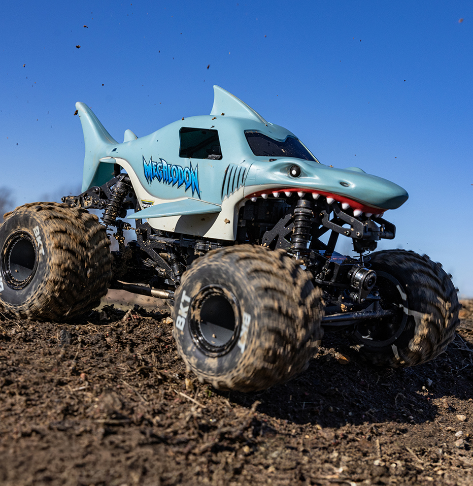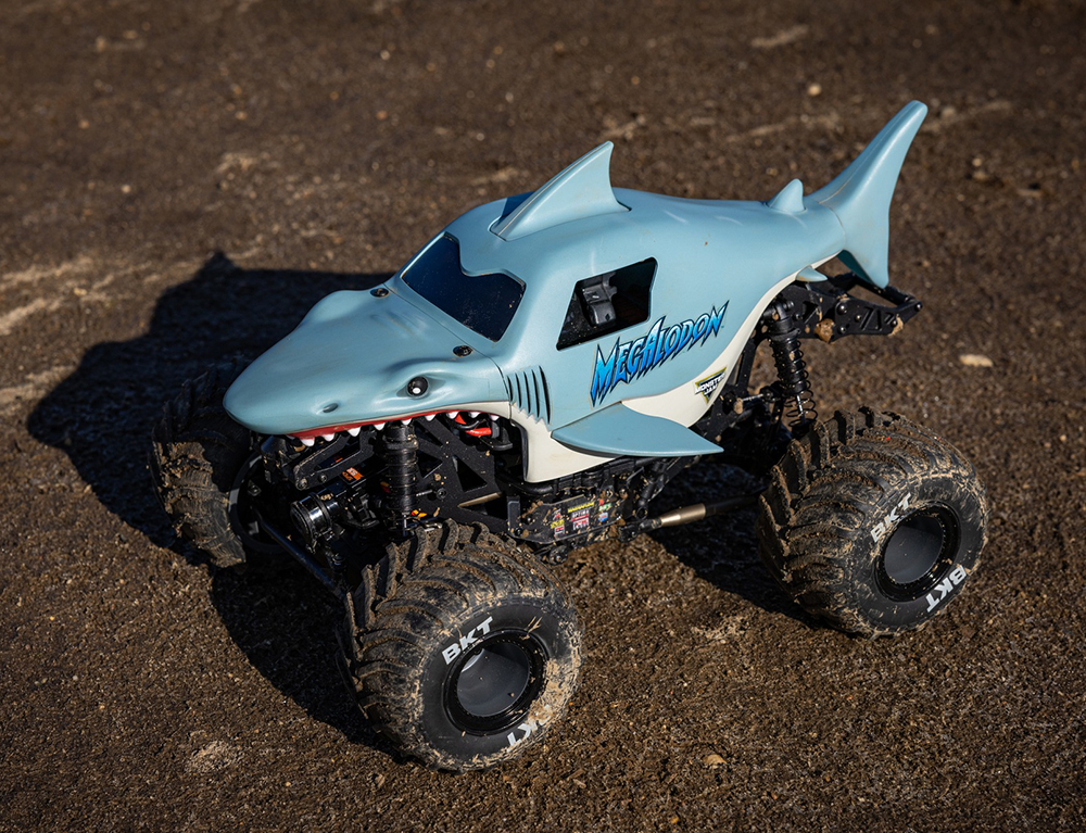 When the full-size Megalodon storms into a stadium, Monster Jam fans of all ages scream. They love its massive fibreglass and foam shark body, with the piercing eyes, pointed fins, and gaping mouth full of pearly whites. There's no other monster truck like it - or like the ready-to-run Losi Mini LMT Megalodon RC version.