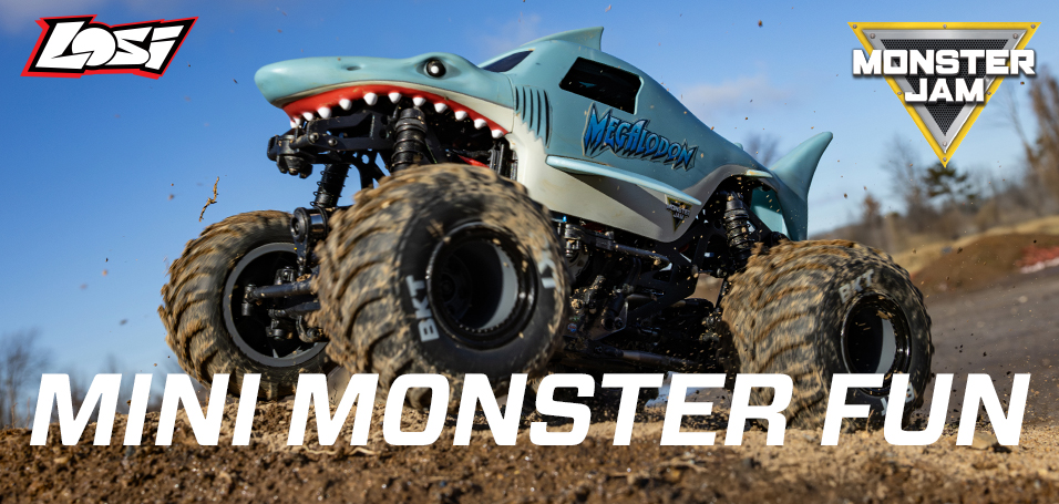 The convenient, affordable, go-anywhere size of Losi Mini LMTs has made them widely popular with everyone from automotive enthusiasts and monster truck fans to RC hobbyists of all ages and skill levels. They capture the looks of their full-scale counterparts and perform great straight out of the box. More Mini LMT body styles have been eagerly anticipated. The wait is over, as Losi presents the Mini LMT Megalodon!