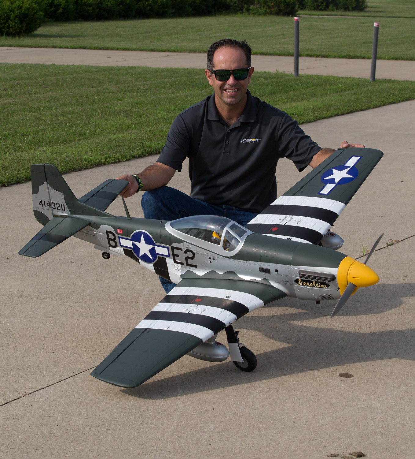 Beyond the factory applied satin-finish printed covering, other iconic details include airfoil-shaped tail surfaces, realistic engine exhaust, wing guns, gear doors, optional-use drop tanks, radio antenna, a 3D instrument panel and a painted pilot figure.