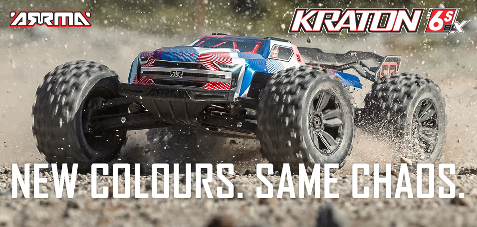 The chassis plate, differentials, front bumper, skid plate, and even the wing mount have all been improved with EXB (Extreme Bash) toughness. New side guards, a two-piece tower-to-tower brace, and inner body tower add more strength and simplify maintenance. The iconic KRATON monster truck body now comes in four striking new multi-colour factory finishes, and has a convenient, quick-release, clipless body retention system.