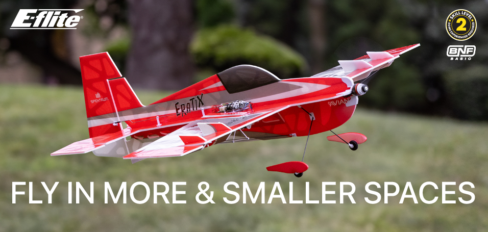 Like other flat foamy models, the UMX Eratix is capable of slow cruising, smooth sport flying, basic aerobatics, and even aggressive 3D flying - all in the same flight! It offers a truly "mild to wild" flight experience intermediate to experienced pilots will appreciate whether flying indoors in living rooms, garages, and gymnasiums, or outdoors in yards, parks, sports fields, and beyond.