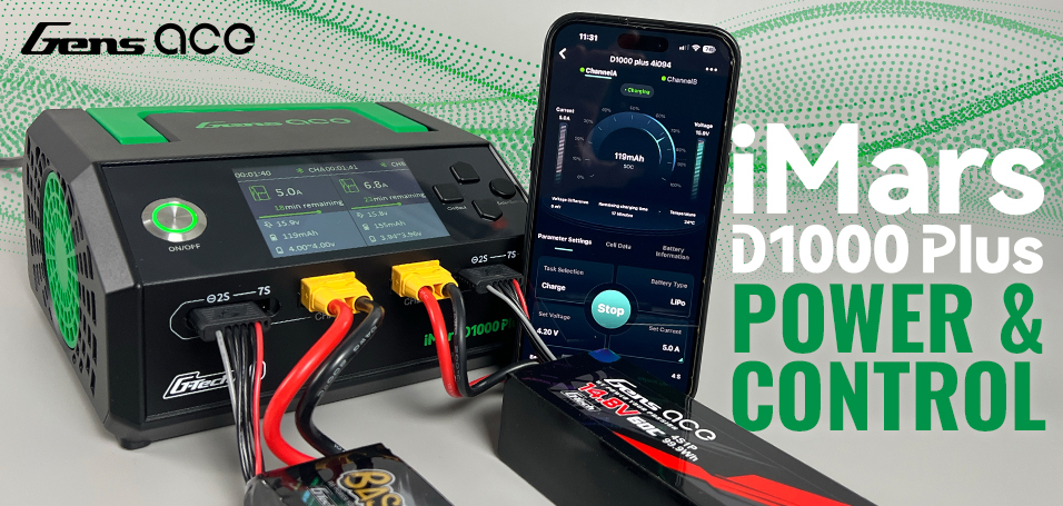 The iMars D1000 PLUS AC is a dual-output, multi-chemistry charger designed to deliver exceptional performance for high-capacity LiPo batteries, offering a total of 1000W charging power. Engineered with advanced G-Tech technology, it seamlessly integrates with the Gens Ace G-Tech ecosystem, simplifying the charging process and enhancing safety through automatic detection and parameter configuration. It offers robust functionality, allowing users to charge two batteries simultaneously-making it an ideal solution for RC enthusiasts involved in flying, sailing, racing, or bashing.