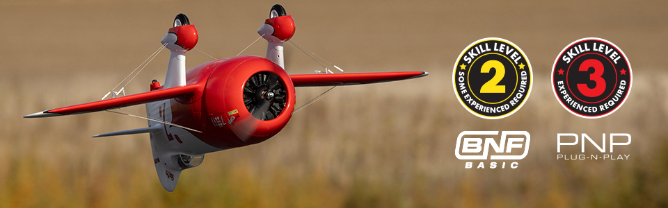 This PNP version requires more experience and skills to assemble and fly than the BNF Basic version because you will need to install a receiver that does not already include properly tuned AS3X+ and SAFE Select technologies. You should have the experience and skills necessary to assemble and successfully fly models like the E-flite T-28 Trojan 1.1m, Sportix 1.1m, Commander mPd 1.4m, or other similar class models before attempting to fly the Gee Bee R-2 1.0m PNP version.
