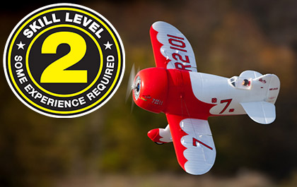 Skill Level 2 aircraft, like this one, are suitable for RC pilots who already have some experience and the skills to assemble and/or set up and fly similar class models. Although this is the easiest-to-fly Gee Bee model yet, it's not a suitable first RC aircraft for new pilots or a "next step after a trainer" model for low-time RC pilots. You should have the experience and skills necessary to successfully fly higher-performance ultra-micro models like the various UMX Timber models, or larger models like the E-flite T-28 Trojan 1.1m, the Commander mPd 1.4m, Timber 1.5m models, or other similar class models before attempting to fly the UMX Gee Bee R-2.